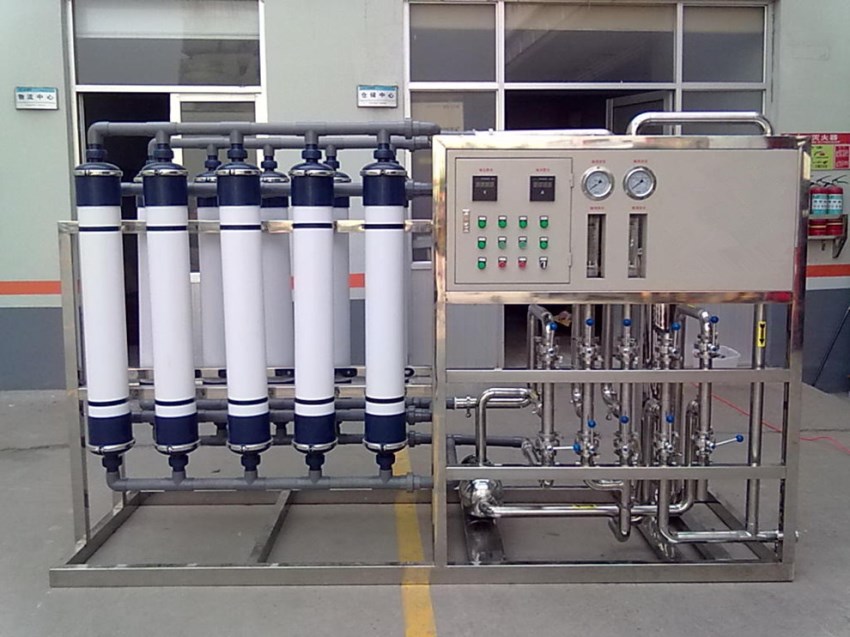 超濾膜如同篩子,在一定壓力(0.1~0.6MPa)下,允許溶劑和小于膜孔徑的溶質透過,而阻止大于孔徑的溶質通過,以完成進水的殺菌凈化而保留水中有益的天然礦物成分,符合國家瓶裝飲用礦泉水以及天然凈水的水質要求,設備嚴格按QS標準制造。